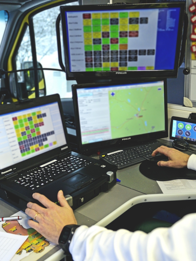 Tilannekeskuksen päivystäjä näkee alueen kaikki yksiköt ja aktiiviset hälytystehtävät. Tavoitettavuusaika näkyy kartalla värikoodattuina vyöhykkeinä ja aikaa arvioitaessa sovellus ottaa huomioon tieverkoston.
